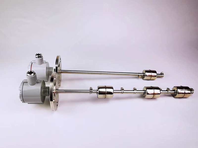 干簧管式浮球液位計工作原理:干簧管式浮球液位計由浮球、插桿等組成。浮球液位計通過連接法蘭安裝于容器頂上,浮球根據(jù)排液體體積相等等原理浮于液面,當容器的液位變化時浮球也隨著上下移動,由于磁性作用,浮球液位計的干簧受磁性吸合,把液面位置變化成電信號,通過顯示儀表用數(shù)字顯示液體的實際位置,浮球液位計從而達到液面的遠距離檢測和控制。浮球變送器上的浮球隨液位上下浮動,使傳感器得到正比于液位的電阻信號,經(jīng)轉換放大變送輸出DC4 -20mA的標準信號??膳c多種二次儀表或計算機構成對液位進行遠距離調節(jié)的測量,顯示和控制系統(tǒng)。